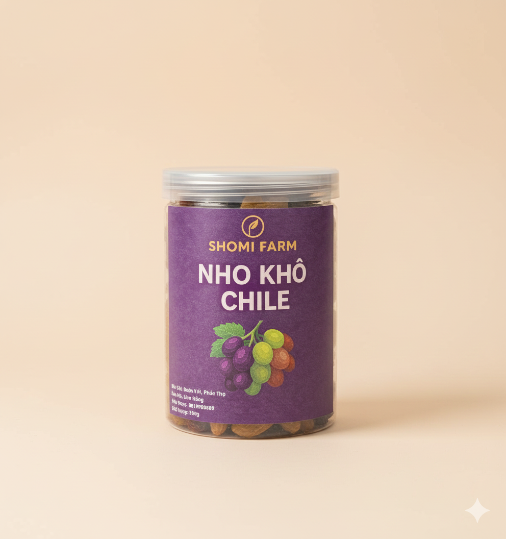 Nho khô Chile cao cấp, hạt to, ngọt tự nhiên không đường. Giàu chất xơ, sắt và kali. Thích hợp làm snack hoặc thêm vào granola, sữa chua, bánh nướng.