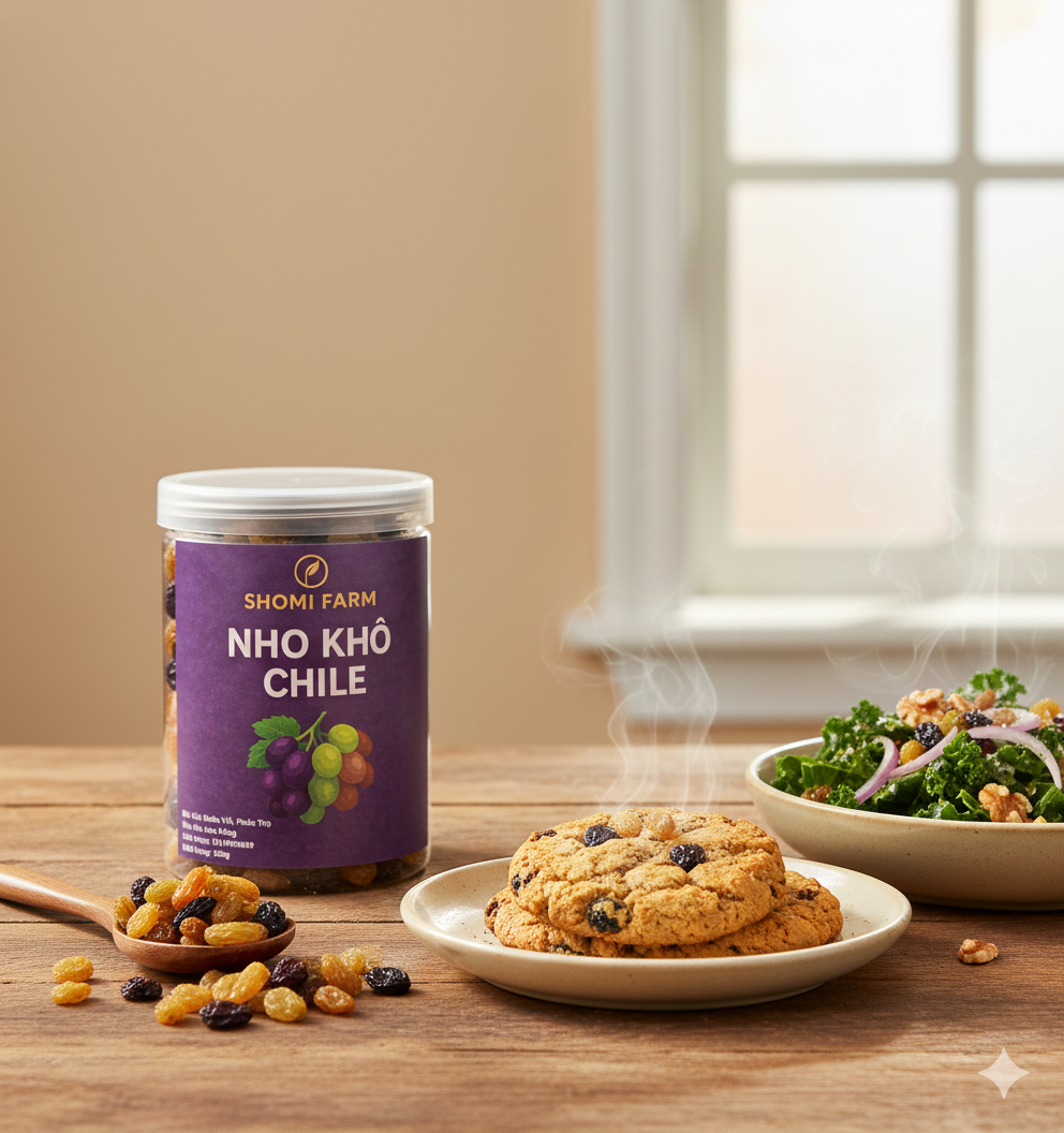 Nho khô Chile cao cấp, hạt to, ngọt tự nhiên không đường. Giàu chất xơ, sắt và kali. Thích hợp làm snack hoặc thêm vào granola, sữa chua, bánh nướng.