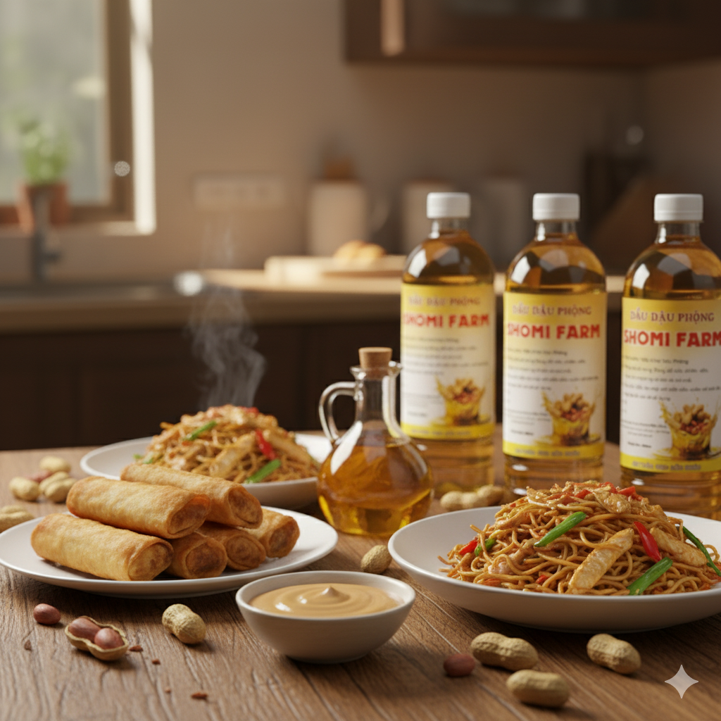 Dầu lạc nguyên chất 100% ép từ đậu phộng Việt Nam. Không tẩy, không chiết xuất hóa học. Giàu vitamin E và chất béo không bão hòa đơn, tốt cho tim mạch. Vị thơm béo tự nhiên, điểm cháy cao, phù hợp cho chiên xào và nấu ăn hàng ngày.